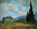 This picture was painted at St Rémy in Provence after he had entered the asylum there in May 1889 and was one of three versions. It is possibly the painting he refers to in a letter to Theo written towards the end of June with `a cornfield very yellow' and the cypress--a tree just then `always occupying my thoughts' that was `a splash of black in a sunny landscape'. The whirling brushstrokes of the sky may at first give the disturbing suggestion of mental imbalance and violence beyond control, but the longer the picture is considered the more consistent it appears as a whole in the multitude of curves that twist and turn and repeat themselves throughout. Nor is it to be supposed that Van Gogh was incapable of anything else. The flame-like form of the cypress sets a key that is followed through with a pervading vibration that represents a sustained effort.